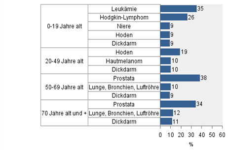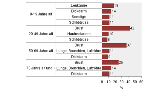 In der Altersklasse 0-19 Jahre tritt Krebs sehr selten auf. 23 Fälle wurden von 2018-2022 bei den jungen Männern verzeichnet. Die häufigsten Krebserkrankungen waren Leukämie (8 Fälle) und Hodgkin-Lymphom (6 Fälle). 28 Fälle wurden bei den jungen Frauen während demselben Zeitraum verzeichnet. Die häufigsten Krebserkrankungen waren Leukämie (5 Fälle), Dickdarmkrebs (4 Fälle) und Schilddrüsentumoren (3 Fälle). Brustkrebs trat bei allen anderen Altersklassen der Frauen von 2018-2022 am häufigsten auf. Bei den Männern im Alter von 20 bis 49 Jahren hingegen waren Hodenkrebs, Hautmelanoma und Dickdarmkrebs die häufigsten Krebserkrankungen. Ab einem Alter von 50 Jahren, war der Prostatakrebs die häufigste Krebserkrankung von 2018-2022.