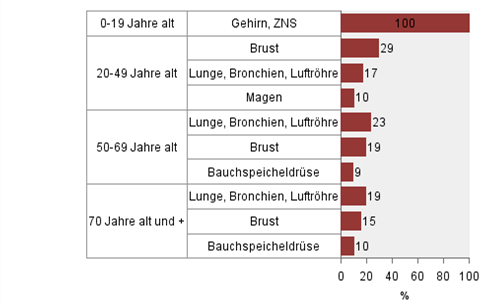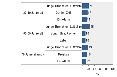 Zwischen 2018-2022 war bei Männern ab 50 Jahren der Lungenkrebs die Hauptursache für Krebstod. Bei den Frauen der Altersklasse 20-49 Jahren war es der Brustkrebs und bei -der Altersklasse 50-69 Jahren und über 70-jährigen der Lungenkrebs.