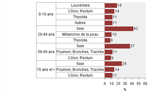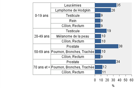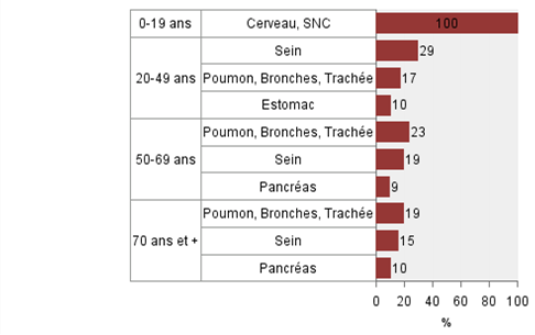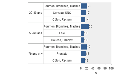 Le cancer du poumon est le premier responsable de décès par cancer chez les hommes à partir de 50 ans en 2018-2022. Chez les femmes, le cancer du sein est le premier responsable des décès par cancer dans les tranches d’âge 20-49 ans en 2018-2022. Le cancer du poumon est le premier responsable des décès par cancer chez les femmes dans les tranches d’âge 50-69 ans et 70 ans et plus, en 2018-2022.